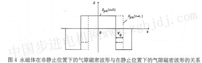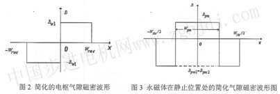 假定鐵心磁導(dǎo)率為無窮大,電機(jī)非飽和,忽略漏磁的影響,電機(jī)靜止時,永磁體單獨(dú)作用下的氣隙磁場左側(cè)氣隙磁密與右側(cè)氣隙磁密相等。電機(jī)靜止時,動子處于軸向的中間位置。****的振蕩幅值約為半個永磁體長,當(dāng)動子在****振幅范圍內(nèi)振蕩時,永磁體在左側(cè)氣隙產(chǎn)生的磁密Bpm1與在右側(cè)氣隙產(chǎn)生的磁密Bpm2相等。永磁體單獨(dú)作用下的氣隙磁密波形可簡化為一方波,