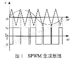 一般PWM調(diào)制是將調(diào)制波與載波的波形進行比較,從而得到的等高而不等寬的脈沖序列。SPWM調(diào)制方式是使脈沖的寬度按照正弦規(guī)律變化,從而在效果上和正弦波等效。即在算法上一開始,就要以正弦波為調(diào)制波。其原理圖如圖1所示。