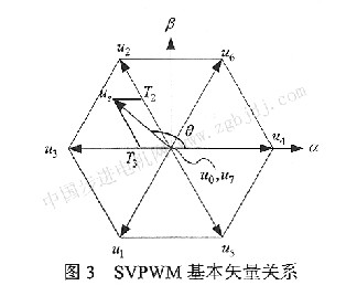而SVPWM的基本思想是通過八組三相電壓式逆變橋的基本電壓矢量(000、001、010、011、100、101、110、111,其中O表示上橋臂關(guān)斷,l表示上橋臂導通)在靜止α、β坐標系中來合成定子相電壓矢量us。