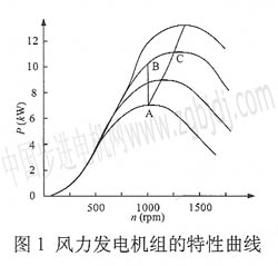 其中:G是風(fēng)力發(fā)電系數(shù),p是空氣密度,v是風(fēng)速,r是渦輪半徑。由給定渦輪機的高速特性曲線可以得到****跟蹤控制的****風(fēng)能捕獲量。風(fēng)力發(fā)電機組的特性曲線如圖1所示。其中有最人風(fēng)能的****軌跡,跟蹤控制的目標是隨著風(fēng)速變化保持渦輪的軌跡在這條曲線上。