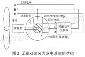 圖2為無刷雙饋風(fēng)力發(fā)電系統(tǒng)的結(jié)構(gòu)。它包含風(fēng)力發(fā)電機組,齒輪箱和無刷雙饋電機。無刷雙饋電機是一種交流勵磁機,具有特殊的結(jié)構(gòu)和性能,類似與同步電機,其優(yōu)勢是功率因數(shù)可調(diào),通過控制風(fēng)力降低變頻器等級要求,這些都大大地降低惡劣系統(tǒng)成本。因此,無刷雙饋電機是最適合于變速恒頻風(fēng)力發(fā)電系統(tǒng),其中轉(zhuǎn)子速度可以在次同步和超同步速度下運行。