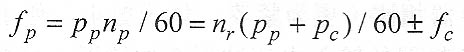 無刷雙饋電機的定子繞組由兩部分組成,一個是電源繞組直接連接到電網(wǎng),另一個是控制繞組通過雙向變頻器連接到電網(wǎng)。轉(zhuǎn)子是鼠籠型,沒有電刷和滑環(huán)。轉(zhuǎn)子極對數(shù)應(yīng)等于兩個定子繞組的總極對數(shù)。Pp和Pc分別代表功率繞組和控制繞組極對數(shù)。功率繞組頻率如下: