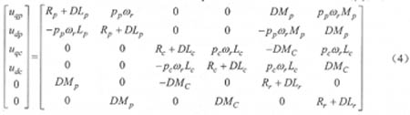 由于BDFM的轉(zhuǎn)子采用鼠籠結(jié)構(gòu),則在轉(zhuǎn)子d—q軸系下,BDFM的電壓方程式(4)所示。