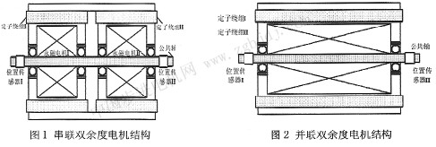 串聯(lián)結(jié)構(gòu)型永磁同步電動機是由兩個獨立的永磁電機同軸同殼安裝,如圖l所示,它有兩套獨立的繞組,兩個分開的轉(zhuǎn)予及兩套位置傳感器,但具有共同的電機軸。在該結(jié)構(gòu)中,幾乎不存在兩套繞組問的磁耦合現(xiàn)象,控制簡單;但其實際上是由兩臺電機串聯(lián)組成的,因此體積較大;同時一個電機發(fā)生故障時,該電機會成為另一臺電機的負載,從而使得電機的機電時間常數(shù)變大,動態(tài)特性降低。