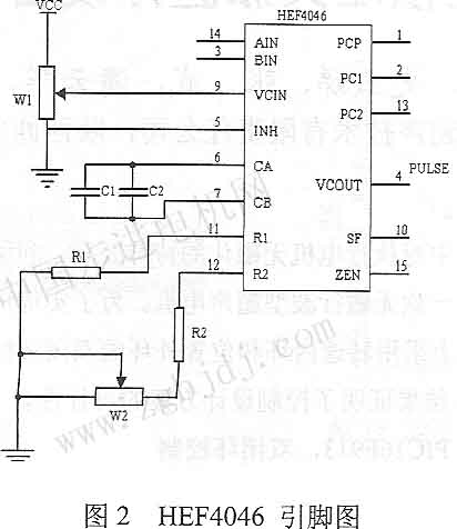 根據(jù)客戶(hù)對(duì)額定力矩要求,選用usM50超聲電機(jī)。而且無(wú)磁電機(jī)要求電機(jī)的各個(gè)零件不能導(dǎo)磁,所以在定子、轉(zhuǎn)子、轉(zhuǎn)軸、軸承、機(jī)殼等材料選擇上必須是不導(dǎo)磁材料。 電機(jī)結(jié)構(gòu)如圖1所示:1****編碼器、2.無(wú)瓷軸承、3機(jī)殼、4轉(zhuǎn)子、5摩擦材料、6定子、7.輸出軸。定子材料采用鋁青銅、轉(zhuǎn)子采用硬鋁合金、軸采用黃銅、機(jī)殼采用鋁合金、軸承采用陶瓷基軸承。 2控制器硬件設(shè)計(jì) 超聲電機(jī)速度調(diào)節(jié)采用調(diào)頻調(diào)速。硬件設(shè)計(jì),采用壓控振蕩器cD4046鎖相環(huán)芯片作為核心。cD4046內(nèi)部含有鑒相器、壓控振蕩器,其外部引腳如圖2所示。作為方波發(fā)生器用,通過(guò)調(diào)節(jié) 9腳輸入電壓巧。大小就可以改變輸出方波信號(hào)。的頻率。
