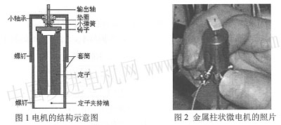該結(jié)構(gòu)的主要特點(diǎn)是整個(gè)驅(qū)動(dòng)機(jī)構(gòu)罩在一個(gè)金屬外套里面,上套筒通過(guò)微軸承、聚四氟乙烯墊圈給小彈簧提供預(yù)緊力。上套筒和軸之間通過(guò)小軸承連接。轉(zhuǎn)子置于定子之上,是電機(jī)的動(dòng)力輸出部分。定子的下端直徑稍大的一段金屬柱做為它的夾持端,通過(guò)這一部分和固定裝置相連。