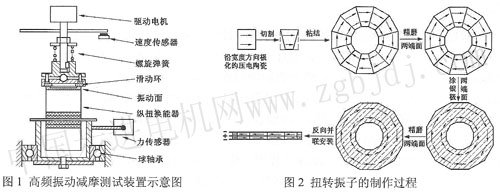 試驗(yàn)所用高頻振動(dòng)減摩測(cè)試裝置示意圖如圖1所示,它主要由驅(qū)動(dòng)電機(jī)、預(yù)緊力加載結(jié)構(gòu)、縱、扭復(fù)合超聲換能器和摩擦力測(cè)量結(jié)構(gòu)等部分組成。其中驅(qū)動(dòng)電機(jī)通過聯(lián)軸器帶動(dòng)轉(zhuǎn)軸轉(zhuǎn)動(dòng),進(jìn)而帶動(dòng)上摩擦副固定盤轉(zhuǎn)動(dòng)。摩擦副之間的接觸形式為盤一盤接觸,下摩擦副為工程塑料,粘貼在縱、扭復(fù)合高頻換能器的端部,縱、扭復(fù)合高頻換能器提供實(shí)驗(yàn)過程中摩擦副之問的振動(dòng)?v、扭復(fù)合高頻換能器固定在一個(gè)可以自由轉(zhuǎn)動(dòng)的底座上,該底座能夠?qū)?shí)驗(yàn)過程中摩擦副之間的摩擦力傳遞給力傳感器。實(shí)驗(yàn)過程中,通過驅(qū)動(dòng)電機(jī)控制上摩擦副的滑動(dòng)速度(滑動(dòng)速度由速度傳感器測(cè)量),通過調(diào)整螺旋彈簧的伸縮長(zhǎng)度控制摩擦副間的預(yù)緊力,通過調(diào)整縱、扭復(fù)合高頻換能器的縱、扭振動(dòng)的輸入電壓,控制摩擦副之間振動(dòng)的形式以及振動(dòng)的幅度,并且上下摩擦副均可方便的更換,將該試驗(yàn)臺(tái)放在真空腔內(nèi)進(jìn)行實(shí)驗(yàn)。真空腔內(nèi)的真空度可實(shí)現(xiàn)由大氣到中真空(2.0Pa)和到高真空(2.0×10-3Pa)的連續(xù)變化。實(shí)驗(yàn)過程中,高頻驅(qū)動(dòng)控制系統(tǒng)在線顯示測(cè)量的摩擦力、滑動(dòng)速度和溫度等參數(shù),并且由計(jì)算機(jī)進(jìn)行實(shí)時(shí)采集。