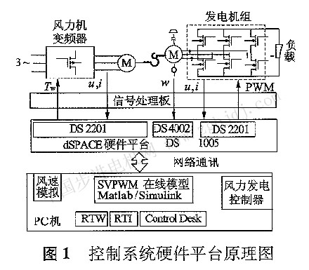 通過控制逆變器PwM來控制發(fā)電機(jī)的電磁轉(zhuǎn)矩,它由鼠籠感應(yīng)發(fā)電機(jī)、逆變器和dsPAcE硬件平臺(tái)構(gòu)成。dsPAcE接口Ds 2201和Ds-4002插件通過信號(hào)處理板接受發(fā)電機(jī)相電流、相電壓和電機(jī)轉(zhuǎn)速信號(hào),輸出控制發(fā)電機(jī)轉(zhuǎn)速轉(zhuǎn)矩的PwM信號(hào)。