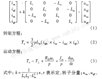 異步電動(dòng)機(jī)的數(shù)學(xué)模型是一個(gè)多變量、非線(xiàn)性、強(qiáng)耦合的系統(tǒng)。如果直接在 H靜止坐標(biāo)系(A—B—c)下建立模型,則其數(shù)學(xué)模型會(huì)非常復(fù)雜。因此一般通過(guò)Park矢量變換[1],將三相靜止坐標(biāo)變換為兩相靜止坐標(biāo)(α-β),然后在兩相靜止坐標(biāo)系上建立異步電動(dòng)機(jī)的數(shù)學(xué)模型。