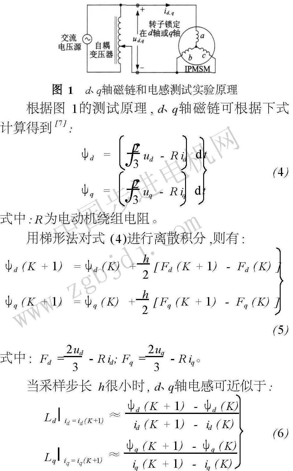 圖1給出了內(nèi)置式永磁同步電動(dòng)機(jī)小目軸磁鏈和電感的測(cè)量原理0¨。實(shí)驗(yàn)時(shí),先用直流電源對(duì)電動(dòng)機(jī)轉(zhuǎn)子進(jìn)行定位,把樣機(jī)轉(zhuǎn)子位置定位在d軸或目軸方向上,并用步進(jìn)電動(dòng)機(jī)鎖定轉(zhuǎn)子位置,通過自耦變壓器調(diào)節(jié)激勵(lì)電壓的幅值,用功率分析儀w T1600捕捉不同電壓激勵(lì)下的電壓和電流。