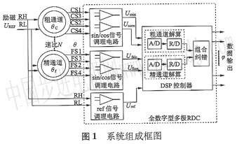 (3)A/D轉(zhuǎn)換加軟件三角法查表解算、組合,精度低。本文采用一種雙通道多極RDc的全數(shù)字式實(shí)現(xiàn)方案,較少的外圍電路元件完成信號(hào)調(diào)理,而其他功能部分全部由DsP利用數(shù)字處理方式實(shí)現(xiàn),具有成本低(千元)、精度高、可擴(kuò)展性好等優(yōu)點(diǎn)。