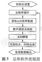 系統(tǒng)中的大部分功能全部由DsP完成,編寫DsP軟件程序,主要實(shí)現(xiàn)A/D轉(zhuǎn)換,R/D角度解算,角度數(shù)據(jù)雙速組合、糾錯(cuò)處理和數(shù)據(jù)輸出功能,其總體軟件流程圖如圖3所示。