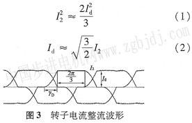 轉(zhuǎn)子電流經(jīng)過整流器后不再是正弦波形,而是近似地由持續(xù)時(shí)間為  的交變方波脈沖組成,如圖3所示。如果斬波器頻率很高,以及平波電感很大,那么整流電流在忽略疊加脈動(dòng)時(shí)基本可以看作直流,并且平均整流電流,Id與轉(zhuǎn)子電流I2有如下關(guān)系: