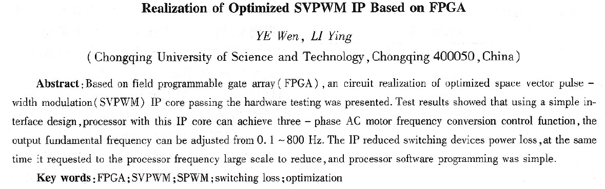 關(guān)鍵詞:FPGA;電壓矢量脈寬調(diào)制;正弦脈寬調(diào)制;開關(guān)損耗;優(yōu)化