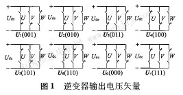 逆變器同一橋臂上的功率器件呈互補的開關(guān)狀態(tài),故三相逆變器6個功率器件有2 3,共8種工作狀態(tài),令E橋臂器件導(dǎo)通為“1”,關(guān)斷為“0”,則這8種工作狀態(tài)可記為U0(000)、U 1(001)、U 2(010)、U 3(011)、U 4 (100)、U 5(101)、U 6(110)和U 7(111),如圖1所示。其中包括6個幅值相等  相位互