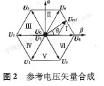 差60。的非零電壓矢量(U1~U6)和2個幅值為零的零電壓矢量(U。,U7),6個非零電壓矢量將理想的圓形磁鏈等分成I~Ⅵ,共6個扇區(qū)。用以產(chǎn)生圓形磁鏈的參考電壓矢量(Uref),可根據(jù)“面積等效”原則,用上述8個電壓矢量中的一個或幾個合成獲得,常用的有三段矢量合成法,即由其所處扇區(qū)的兩個相鄰的非零電壓矢量和零電