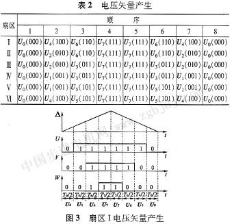 因矢量作用效果僅和其持續(xù)時間有關(guān),為降低電機轉(zhuǎn)矩脈動,通常將各矢量分二次產(chǎn)生。此外為降低功率器件開關(guān)損耗,采用電壓矢量每次切換僅有一相功率器件的狀態(tài)發(fā)生變化的方式,確定各矢量的產(chǎn)生順序。依據(jù)上述原則所確定的各扇區(qū)矢量產(chǎn)生順序如表2所示。圖3為扇區(qū)I矢量產(chǎn)生情況,圖中△為PwM載波,U、V、W為三相功率器件的PWM控制信號。