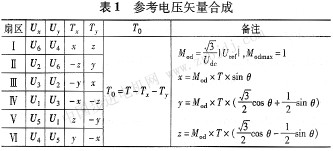 以Uref旋轉(zhuǎn)方向定向,相位超前電壓矢量為Ux滯后為Uy,作用時間分別為Tx、Ty,Mod為幅度調(diào)制比。由于非零電壓矢量沿αβ軸對稱分布,則各扇區(qū)內(nèi)電壓矢量作用時間的一般表達(dá)式如表l所示。