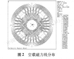 空載漏磁系數(shù)是指電動(dòng)機(jī)空載時(shí)的總磁通Φ與主磁通Φδ 0之比。它的大小不僅標(biāo)志著永磁體的利用程度,而且對(duì)電動(dòng)機(jī)中永磁材料抗去磁能力和電動(dòng)機(jī)的性能也有較大的影響。通常的解析法計(jì)算漏磁系數(shù)誤差較大:本文首先建立ANsYs樣機(jī)模型,然后分別選擇永磁體與氣隙路徑進(jìn)行電磁場(chǎng)數(shù)值計(jì)算,算出空載漏磁系數(shù)  圖2顯示了ANsYs中樣機(jī)模型的空載磁力線分布。