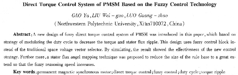 關(guān)鍵詞:永磁同步電動(dòng)機(jī);直接轉(zhuǎn)矩控制;模糊控制;占空比;轉(zhuǎn)矩脈動(dòng)