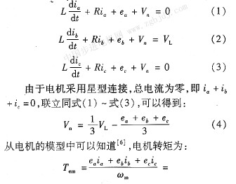 換相時(shí),存在兩種情況,一是三相橋兩個(gè)上橋臂之間換流;二是兩個(gè)下橋臂之間換流。由于這兩種方式是對稱的,下面用上橋臂之間換流進(jìn)行分析,假設(shè)A相退出,B相開通,Tl關(guān)斷,13導(dǎo)通(如圖3所示)。由于換相時(shí)間很短,近似認(rèn)為A相反電動(dòng)勢為E,B相反電動(dòng)勢為E,c相反電動(dòng)勢為一E,列出此時(shí)的電路方程為: