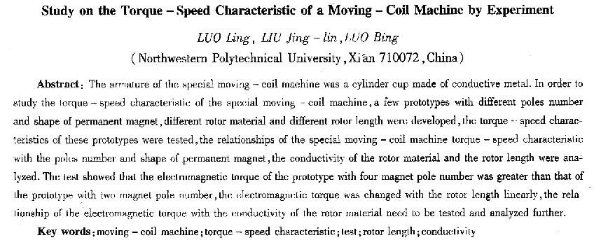 摘要:一種特殊空心杯電機(jī)的電樞是由導(dǎo)電材料制成的杯子,為了研究其電磁阻力矩特性,研制了不同磁路結(jié)構(gòu)、轉(zhuǎn)子材料和轉(zhuǎn)子長(zhǎng)度的樣機(jī)。樣機(jī)實(shí)驗(yàn)表明:四極空心杯電機(jī)的電磁阻力矩大亍二極;電磁阻力矩和轉(zhuǎn)子長(zhǎng)度成正比;電磁阻力矩與轉(zhuǎn)子材料電導(dǎo)率的關(guān)系與理論分析尚有出入,有待進(jìn)一步驗(yàn)證。