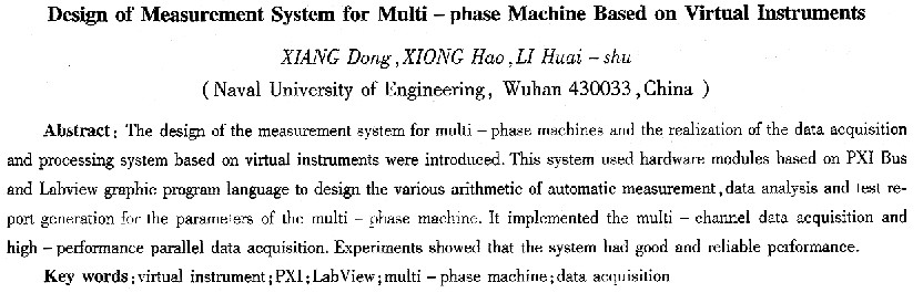 摘要:介紹了基于虛擬儀器的多相電機(jī)測(cè)試系統(tǒng)的設(shè)計(jì)與實(shí)現(xiàn),在設(shè)計(jì)該系統(tǒng)時(shí)采用了符合PXI總線規(guī)定的硬件儀器模塊,使用圖形化編程語(yǔ)言LabView設(shè)計(jì)了多相電機(jī)參數(shù)自動(dòng)測(cè)試的各種算法,實(shí)現(xiàn)了多通道同時(shí)快速數(shù)據(jù)采集以及并行同步采集。實(shí)際應(yīng)用結(jié)果表明該系統(tǒng)穩(wěn)定可靠,測(cè)量結(jié)果達(dá)到了設(shè)計(jì)要求的精度。