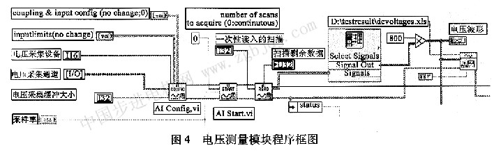 變換后的電壓信號(hào)傳送到PXI總線儀器。PxI總線儀器是由PxI機(jī)箱、MXI-3控制器接口卡和各種測(cè)量?jī)x器模塊構(gòu)成。通過運(yùn)行在控制計(jì)算機(jī)中的程序進(jìn)行控制,完成對(duì)來(lái)自信號(hào)變換電路的電壓信號(hào)的采集和傳輸。控制計(jì)算機(jī)完成對(duì)PXI總線儀器的功能設(shè)置、信號(hào)同步和觸發(fā)、運(yùn)行控制、數(shù)據(jù)處理和記錄等功能。