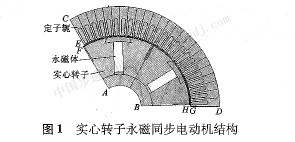 實(shí)心轉(zhuǎn)子永磁同步電動(dòng)機(jī)與實(shí)心轉(zhuǎn)子異步電動(dòng)機(jī)類似,他們的定子結(jié)構(gòu)均與普通異步電動(dòng)機(jī)相同,而轉(zhuǎn)子為實(shí)心鐵磁圓柱體內(nèi)嵌入永磁體。整個(gè)電機(jī)與其他類型永磁電機(jī)相比,結(jié)構(gòu)簡單,轉(zhuǎn)子的機(jī)械可靠性高;起動(dòng)性能好,起動(dòng)轉(zhuǎn)矩大而起動(dòng)電流小,特別適合于重載起動(dòng);由于電機(jī)運(yùn)行于同步轉(zhuǎn)速,轉(zhuǎn)子鐵心的渦流損耗大幅降低,克服了實(shí)心轉(zhuǎn)子異步電動(dòng)機(jī)效率和功率因數(shù)較低的缺點(diǎn)。該類電機(jī)已在油田游梁式抽油機(jī)中得到應(yīng)用。