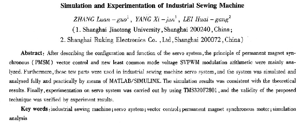 摘要:在介紹逆變器一工業(yè)縫紉機(jī)伺服系統(tǒng)的組成結(jié)構(gòu)和功能工藝的基礎(chǔ)上,主要分析了PMSM矢量控制的調(diào)速原理,新型的共模電壓最小的SVPWM調(diào)制算法。并將上述兩個(gè)部分作用在整個(gè)新型工業(yè)縫紉機(jī)交流伺服系統(tǒng)中,利用MATLAB/SIMULINK軟件對(duì)該系統(tǒng)給予了全面的仿真分析,所得的仿真結(jié)果與理論分析結(jié)果一致。并利用DSP TMS320F2801作為工業(yè)縫紉機(jī)伺服系統(tǒng)的控制芯片進(jìn)行了試驗(yàn)研究,所得的試驗(yàn)結(jié)果驗(yàn)證了設(shè)計(jì)方案的有效性。