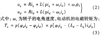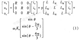 式中:U a、U b、U c為三相定子繞組的電壓,i a、i b、i c。為三相定子繞組的電流,R為每相定子繞組的電阻,Ld=Lq=L為交軸和直軸電感,LM為繞組問(wèn)的互感,p為微分算子  為電動(dòng)機(jī)角速度,K e為電壓常數(shù),θ為轉(zhuǎn)子位置角,即轉(zhuǎn)子與a相軸線的夾角。