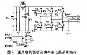 電動(dòng)機(jī)及同步電動(dòng)機(jī)等,主要包括:三相全橋整流電路及IGBT逆變橋電路、PWM死區(qū)生成(圖中未畫出)及隔離放大電路、檢測及保護(hù)電路三部分。其中,6路:PWM調(diào)制信號經(jīng)硬件死區(qū)生成電路后(死區(qū)時(shí)間t=5μs,再經(jīng)T12250隔離放大后控制IG—BT模塊的通斷。同時(shí),針對電機(jī)運(yùn)行過程中可能發(fā)生的過流、過壓等故障,系統(tǒng)實(shí)時(shí)檢測主電路輸出端U、V兩相的電流iv、iv及母線電壓璣,一旦故障發(fā)生,立即將PWM封鎖信號BRA置為低電平,使全部IGBT模塊迅速關(guān)斷。另外,為防止電機(jī)起動(dòng)時(shí)大電流沖擊、IGBT過熱等問題,系統(tǒng)設(shè)計(jì)了延時(shí)起動(dòng)、IGBT模塊的過熱檢測及保護(hù)、電機(jī)急停、能耗制動(dòng)、故障復(fù)位等其它輔助功能。