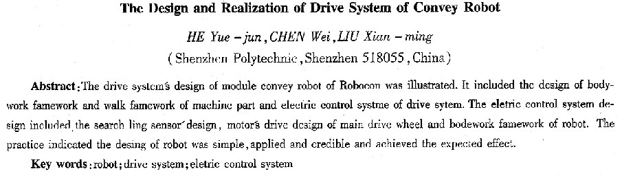 摘要:闡明了Robocon大賽模塊搬運(yùn)機(jī)器人驅(qū)動(dòng)系統(tǒng)的設(shè)計(jì)。該設(shè)計(jì)包括驅(qū)動(dòng)系統(tǒng)機(jī)械部分的車載機(jī)構(gòu)和行走機(jī)構(gòu)的設(shè)計(jì),以及電控系統(tǒng)的設(shè)計(jì),電控系統(tǒng)的設(shè)計(jì)包括尋線傳感器的設(shè)計(jì)、主驅(qū)動(dòng)輪的電機(jī)驅(qū)動(dòng)和車載機(jī)構(gòu)電機(jī)的驅(qū)動(dòng)設(shè)計(jì)。實(shí)踐表明,機(jī)器人設(shè)計(jì)方法簡單,實(shí)用可靠,達(dá)到了預(yù)|十的效果。