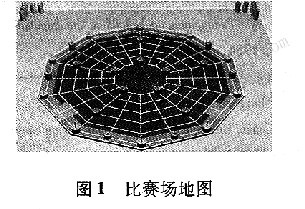 Robocort為亞洲廣播電視聯(lián)合會(huì)(ABU)舉辦的亞洲年度大學(xué)生機(jī)器人大賽,主題是根據(jù)黃帝造指南車的故事制定的“華夏之光”。比賽規(guī)則主要內(nèi)容如下:紅隊(duì)和綠隊(duì)分別采用手動(dòng)機(jī)器人(代表黃帝)和自動(dòng)機(jī)器人(代表工匠)把木塊(紅隊(duì)為紅色模塊,綠隊(duì)為綠色模塊)放到“戰(zhàn)車”(場上的墩子)上。把木塊放到“戰(zhàn)車”頂部的隊(duì)占有了這輛“戰(zhàn)車”,并得分,內(nèi)圈、中圈到外圈戰(zhàn)車的分值分別為3分、2分和1分。****占有比賽場地中央的3輛“戰(zhàn)車”,建成V字形“指南車”的隊(duì)就是獲勝隊(duì)。在兩隊(duì)均未建成“指南車”的情況下,得分多的隊(duì)獲勝。整場比賽定為3分鐘。本文主要闡明我校帶主從機(jī)械手的自主型模塊搬運(yùn)機(jī)器人(即我方比賽中的自動(dòng)機(jī)器人)驅(qū)動(dòng)系統(tǒng)的設(shè)計(jì)。