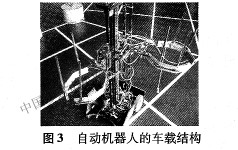車載機(jī)構(gòu)結(jié)構(gòu)圖如圖3所示。它的作用在于:當(dāng)機(jī)器人到達(dá)指定的地點(diǎn)后,用從機(jī)械手拔除對(duì)方的模塊(由于我方機(jī)器人帶有顏色攝像頭,因而可以識(shí)別敵、我模塊),然后通過機(jī)械手轉(zhuǎn)換機(jī)構(gòu),使正交排列的從機(jī)械手和主機(jī)械手同時(shí)逆時(shí)針轉(zhuǎn)動(dòng)90。,機(jī)器人前面的從機(jī)械手轉(zhuǎn)到機(jī)器人左邊,主機(jī)械手轉(zhuǎn)到機(jī)器人正前方,機(jī)器人采用主機(jī)械手安放己方事先拿好的模塊。