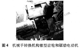 由于比賽對(duì)機(jī)器人的總重量有要求,因而我們?cè)谠O(shè)計(jì)上,從機(jī)械手重量較輕,功能上僅用于拔取和丟棄對(duì)方的模塊。而主機(jī)械手則擔(dān)任主要任務(wù),用于搬運(yùn)和安放自己的模塊。主從機(jī)械手轉(zhuǎn)換機(jī)構(gòu)采用錐形齒輪傳動(dòng),其錐型齒輪和轉(zhuǎn)換驅(qū)動(dòng)電動(dòng)機(jī)如圖4所示。