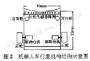 行走機(jī)構(gòu)采用輪式驅(qū)動(dòng)方式,其結(jié)構(gòu)外形示意圖如圖2所示。其主要功能是使機(jī)器人按照設(shè)定,到達(dá)預(yù)先的位置。它由兩個(gè)24 V伺服直流電動(dòng)機(jī)和兩個(gè)萬向輪組成。兩個(gè)直流電動(dòng)機(jī)安裝在機(jī)器人的后方,分別驅(qū)動(dòng)兩個(gè)后輪,為機(jī)器人行動(dòng)提供動(dòng)力。車輪外加軟性橡膠材料,以增加車輪摩擦系數(shù)。兩個(gè)萬向輪安裝在機(jī)器人的前方,為機(jī)器人本體提供穩(wěn)定的支撐,并跟隨驅(qū)動(dòng)輪的運(yùn)動(dòng)方向運(yùn)動(dòng)。在控制上,我們通過安裝在車前的紅外反射式傳感器陣列,檢測場地上的白色引導(dǎo)線,以分別控制兩個(gè)行車電機(jī)的轉(zhuǎn)速差,從而控制機(jī)器人按事先規(guī)劃的路徑行進(jìn)。