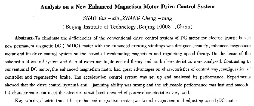 摘要:為了消除傳統(tǒng)型直流電機(jī)驅(qū)動(dòng)控制系統(tǒng)應(yīng)用在電動(dòng)公交車時(shí)存在的缺陷,依據(jù)弱磁調(diào)速的控制思想,研制出新型的續(xù)流增磁電機(jī)及其驅(qū)動(dòng)控制系統(tǒng)。依據(jù)控制系統(tǒng)原理圖和試驗(yàn)數(shù)據(jù),分析了系統(tǒng)弱磁凋速原理和工作特性。與傳統(tǒng)型串勵(lì)直流電機(jī)相比,該系統(tǒng)在控制思想、控制結(jié)構(gòu)和再生制動(dòng)性能方面均具有極大的優(yōu)越性。建立加速度控制系統(tǒng)傳遞函數(shù)并分析其穩(wěn)定性。試驗(yàn)結(jié)果表明該系統(tǒng)抗干擾能力強(qiáng)、調(diào)節(jié)速度快、平穩(wěn)性好。工作特性能很好地滿足電動(dòng)公交車的動(dòng)力特性要求。