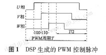 本文所述電動(dòng)機(jī)控制系統(tǒng)中使用的DSP芯片為TMS320LF2407A。該DSP專用于電動(dòng)機(jī)控制,內(nèi)含PWM生成單元,只需設(shè)置相應(yīng)的控制寄存器就可以生成需要的PWM控制脈沖。圖l為三相逆變器上橋臂功率器件的PWM控制脈沖示意圖,三相控制信號中線對齊,且各自左右對稱。