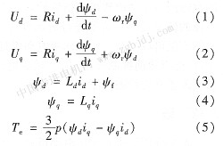 忽略電機(jī)鐵心的飽和,不計(jì)電機(jī)的渦流和磁滯損耗,且電機(jī)的相電流波形為對稱的三相正弦波。轉(zhuǎn)子旋轉(zhuǎn)d,gT坐標(biāo)系下永磁同步電動(dòng)機(jī)數(shù)學(xué)模型: