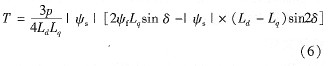 式中:Ud、Uq為定子直軸、交軸電壓;Ψd、Ψq為定子直、交軸磁鏈;id、iq為定子直、交軸的電流;Ψf為轉(zhuǎn)子磁鏈;R為定子繞組電阻;ωr為轉(zhuǎn)子機(jī)械角度;Te為電磁轉(zhuǎn)矩;p為電機(jī)磁極對數(shù)。經(jīng)坐標(biāo)變化可得定子同步旋轉(zhuǎn)dsqs坐標(biāo)下轉(zhuǎn)矩表達(dá)式: