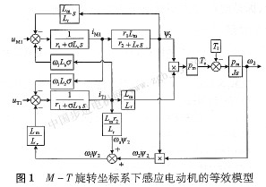 式中:σ為定子瞬間電感系數(shù),  分別為電磁轉(zhuǎn)矩和負(fù)載轉(zhuǎn)矩,P為極對數(shù),J為轉(zhuǎn)動慣量,可得M-T同步旋轉(zhuǎn)坐標(biāo)系下感應(yīng)電動機(jī)的等效模型結(jié)構(gòu),如圖l所示。