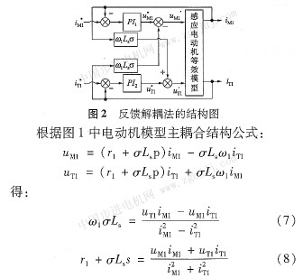 反饋解耦算法是矢量控制交叉解耦中常見的解耦算法,它將感應(yīng)電動機(jī)的M、T軸電流的反饋量用于電動機(jī)解耦電壓的計算,并將其引入電機(jī)控制電壓輸入端進(jìn)行疊加補(bǔ)償。這種解耦算法是建立在定子電流反饋量無延遲,和交叉耦合項中的電機(jī)自感系數(shù)Ls、漏感系數(shù)σ的計算估算值和實際值高度吻合基礎(chǔ)上的。當(dāng)電機(jī)參數(shù)改變或者運(yùn)行頻率改變時,解耦電壓的計算值與實際值之間分別存在偏差  不可能達(dá)到完全解耦[7]。本文以反饋解耦法為例,提出實時計算等效解耦參數(shù)的方法,反饋解耦法的結(jié)構(gòu)如圖2所示。