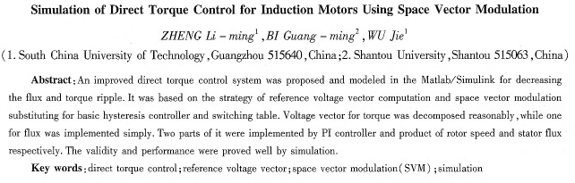 關(guān)鍵詞:直接轉(zhuǎn)矩控制;參考電壓矢量;矢量調(diào)制;仿真