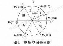 sVM是在一個(gè)控制周期內(nèi),按照sVM算法,在不同的扇區(qū)內(nèi),從逆變器的8個(gè)基本空間電壓矢量中選擇合適的矢量來(lái)合成目標(biāo)矢量。如圖1所示。
