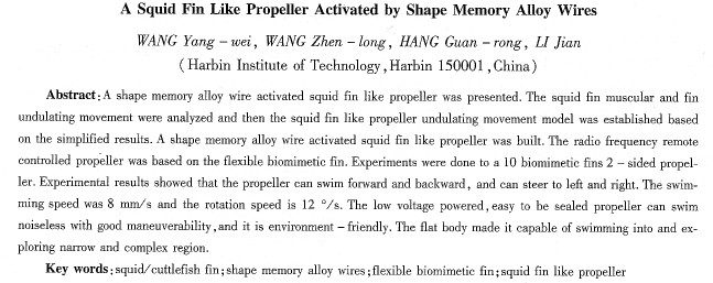關(guān)鍵詞:烏賊鰭;形狀記憶合金絲;柔性鰭單元;仿烏賊水平鰭推進(jìn)器
