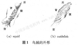 烏賊屬于頭足綱動(dòng)物,是無脊椎軟體動(dòng)物。烏賊(如圖1所示)在英文中有兩種叫法:一種叫Squid,另一種叫Cuttlefish。從圖上可以看出他們在外形上有所不同,Squid尾部的鰭較小,主要是用來