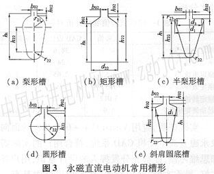 為使軟件通用性更強,電機設計模塊可根據(jù)不同的需要提供了不同的選擇,定子槽形有梨形槽、半梨形槽或斜肩圓底槽、矩形槽結(jié)構(gòu),在容量極小的永磁直流電動機中,也有選擇圓形槽的。圖3為常用定子槽形結(jié)構(gòu)示意圖。