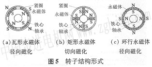 轉(zhuǎn)子可分為內(nèi)轉(zhuǎn)式、外轉(zhuǎn)式以及徑向或軸向氣隙構(gòu)造。內(nèi)轉(zhuǎn)子旋轉(zhuǎn)產(chǎn)生的慣量較小,通常用于伺服控制;外轉(zhuǎn)式旋轉(zhuǎn)慣量較大,適合用于直接驅(qū)動的場合。另外電機依轉(zhuǎn)子結(jié)構(gòu)可以分為表面附著型、內(nèi)藏型以及嵌入型,而經(jīng)常使用的是表面附著型和內(nèi)藏型,其中內(nèi)藏型永磁電機是將永磁體埋入轉(zhuǎn)子內(nèi),結(jié)構(gòu)堅固,可承受高轉(zhuǎn)速所產(chǎn)生的離心力,經(jīng)常被應用在高速的場合;表面附著型永磁電機應用于低速到中速的范圍之間,具有固定的轉(zhuǎn)特性,并且也可以維持高效率的性能。常用的轉(zhuǎn)子勵磁結(jié)構(gòu)如圖5所示。