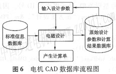 本電機cAD系統(tǒng)是利用已經(jīng)存在的電機設計方案參數(shù)來進行電磁修改設計的。該實現(xiàn)過程主要分為以下三個步驟:(1)輸入產(chǎn)品的原始設計參數(shù)和標準信息數(shù)據(jù);(2)設計人員根據(jù)用戶產(chǎn)品需要修改其中的一些參數(shù),系統(tǒng)根據(jù)該參數(shù)值,對產(chǎn)品重新進行具體設計(包括結(jié)構(gòu)設計、尺寸設計、優(yōu)化設計等);(3)利用cAD系統(tǒng)產(chǎn)生計算單。以上每一步驟中,系統(tǒng)都與數(shù)據(jù)庫緊密聯(lián)系,其流程圖如圖6所示.